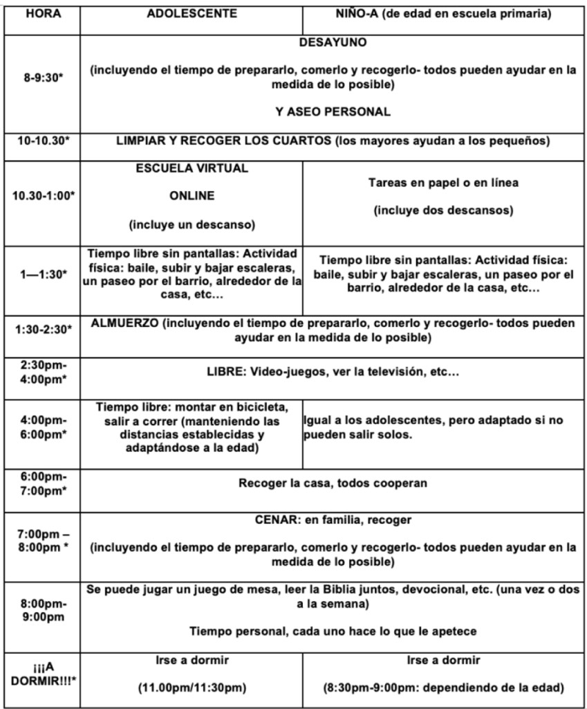 Este es un horario “muestra” que provee opciones para hijos de diferentes edades. Por favor adáptelo a sus circunstancias personales, es solo un ejemplo.